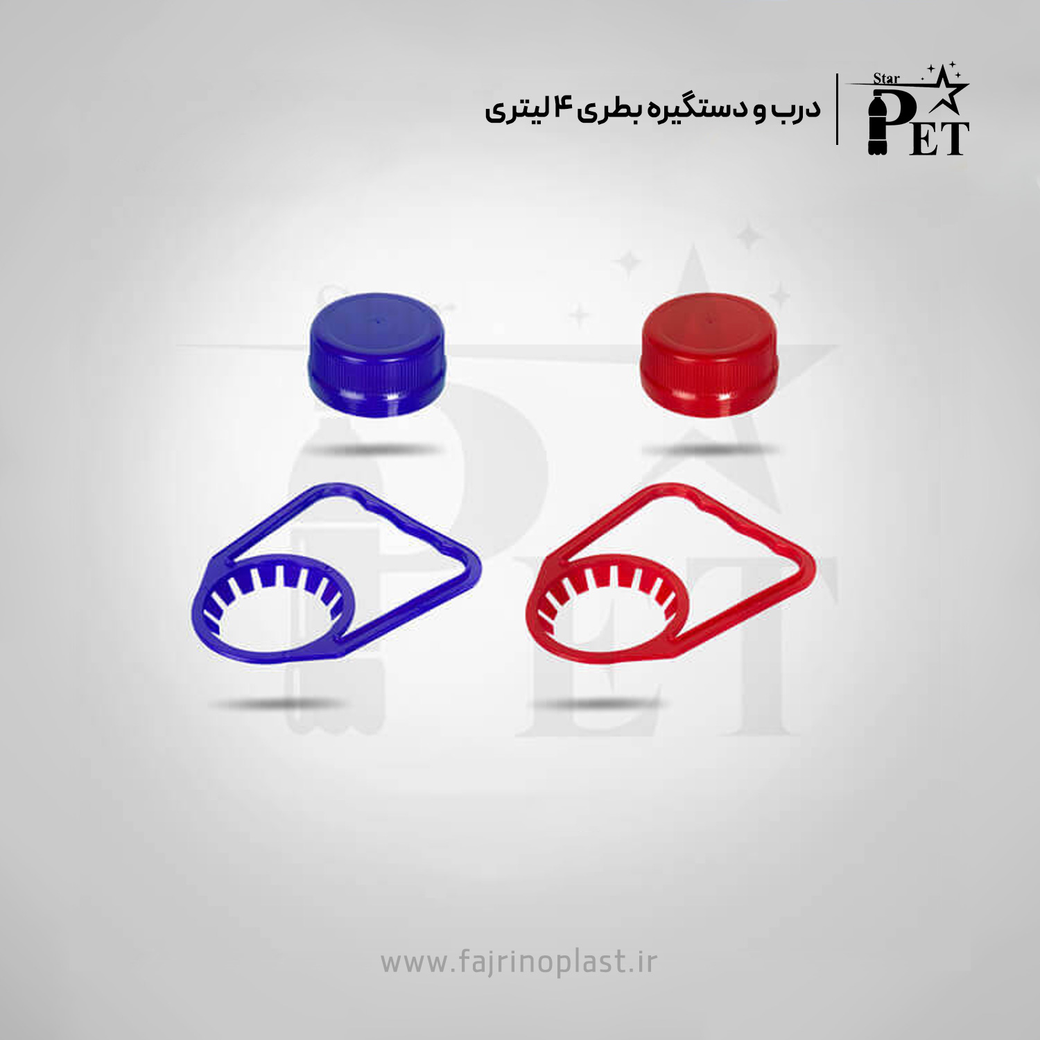 بررسی مشخصات و قیمت درب و دستگیره بطری ۴ لیتری ؛ نسخه پلاستیکی در دو رنگ آبی و قرمز.